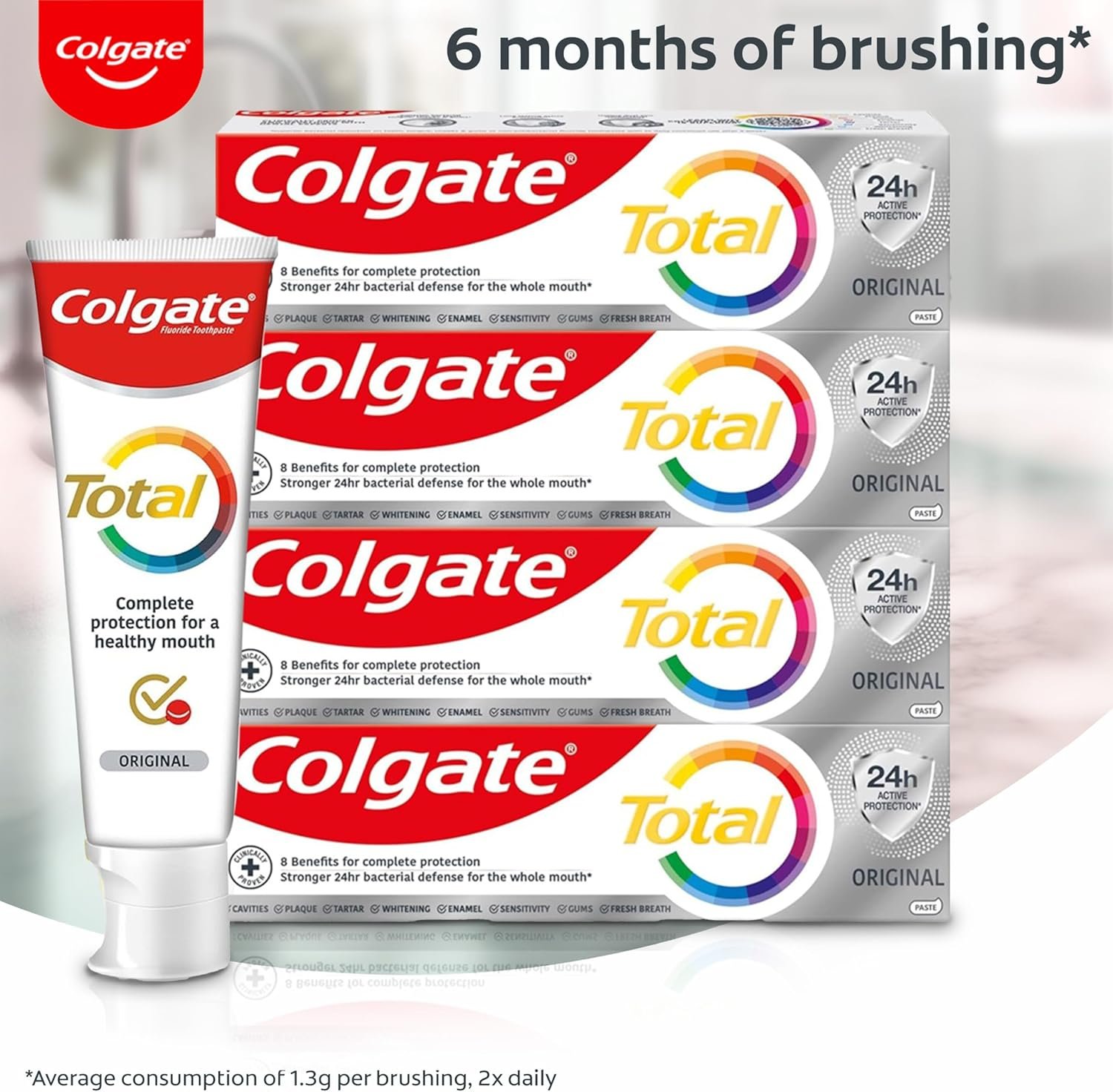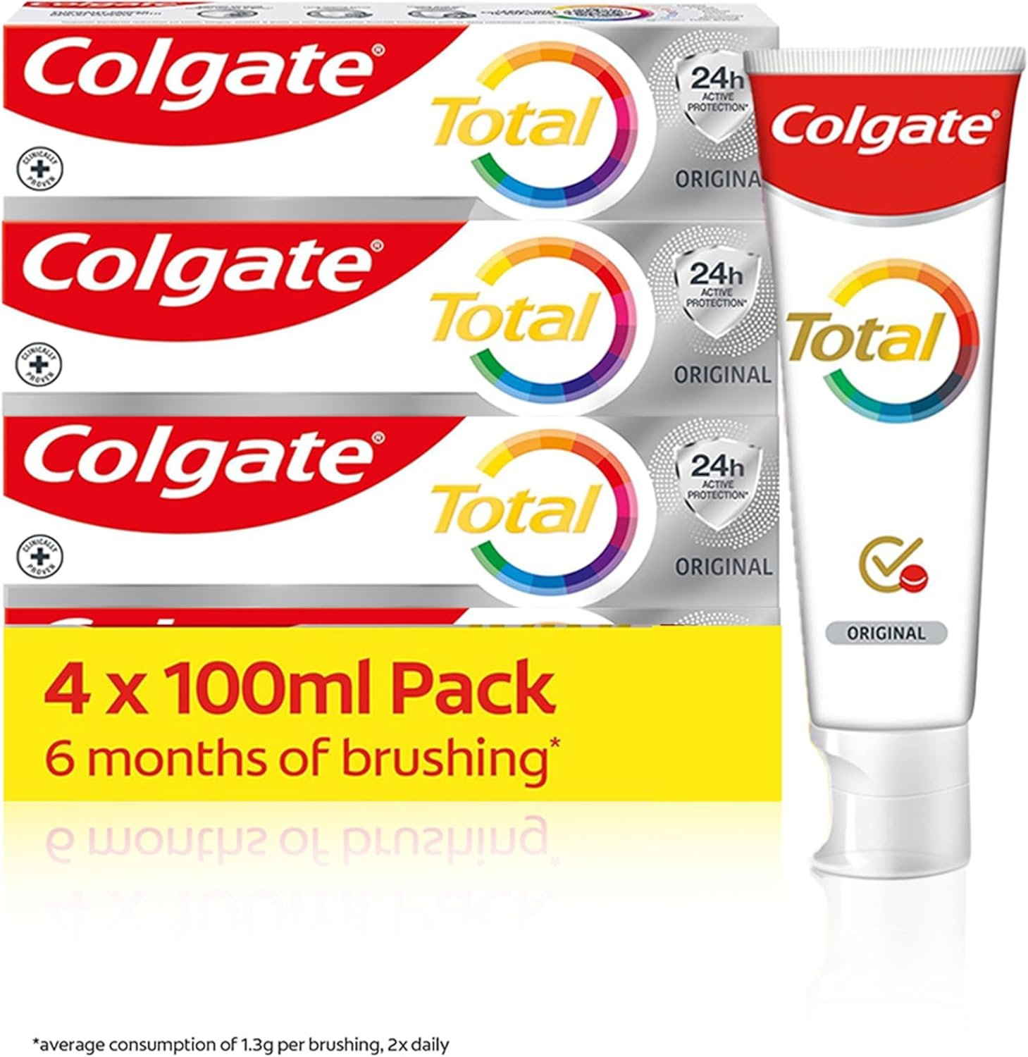 Maintain a healthy, confident smile with Colgate Total Original Toothpaste. This multipack includes four 100ml tubes, providing you with 6 months of brushing to ensure your oral health is always a priority.