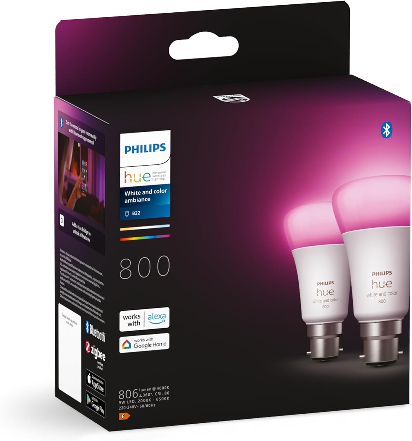 Elevate your home lighting with the Philips Hue White and Colour Ambiance Smart Bulb Twin Pack. Designed with a B22 Bayonet Cap, these LED bulbs offer 800 lumens (60W equivalent), providing the perfect brightness for smaller spaces like your living room or bedroom.